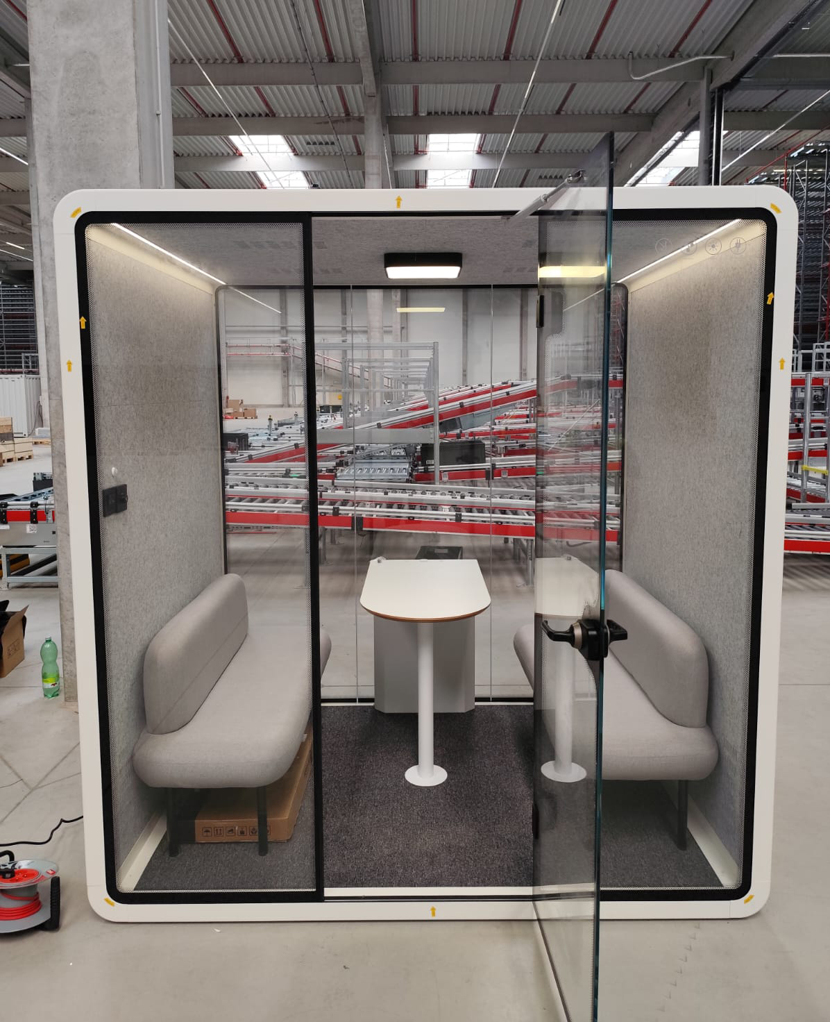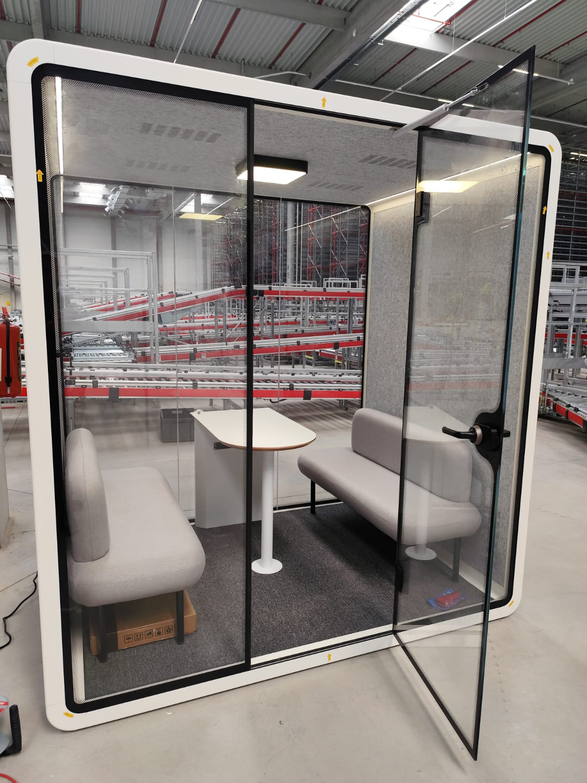 The acoustic box is a meeting room for four people, providing a quiet environment for focused work, phone calls, or meetings. The full description and parameters
