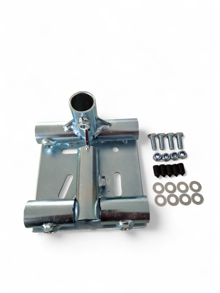 Corner connecting pipe holder with holes for fixing wheels with a plate. Color silver.