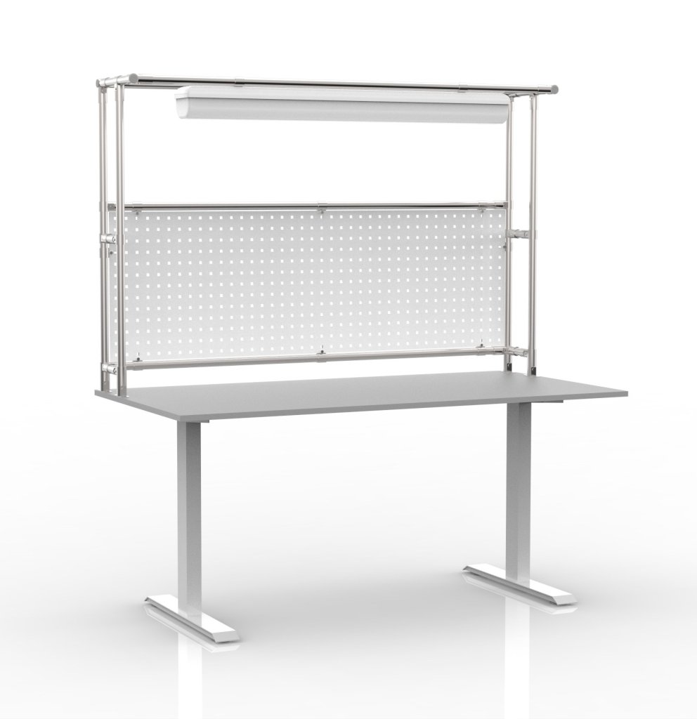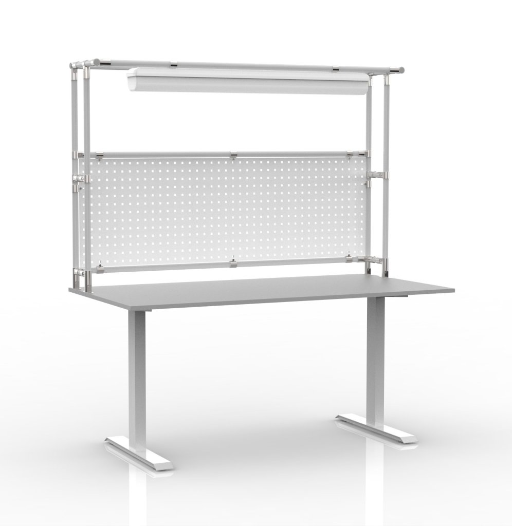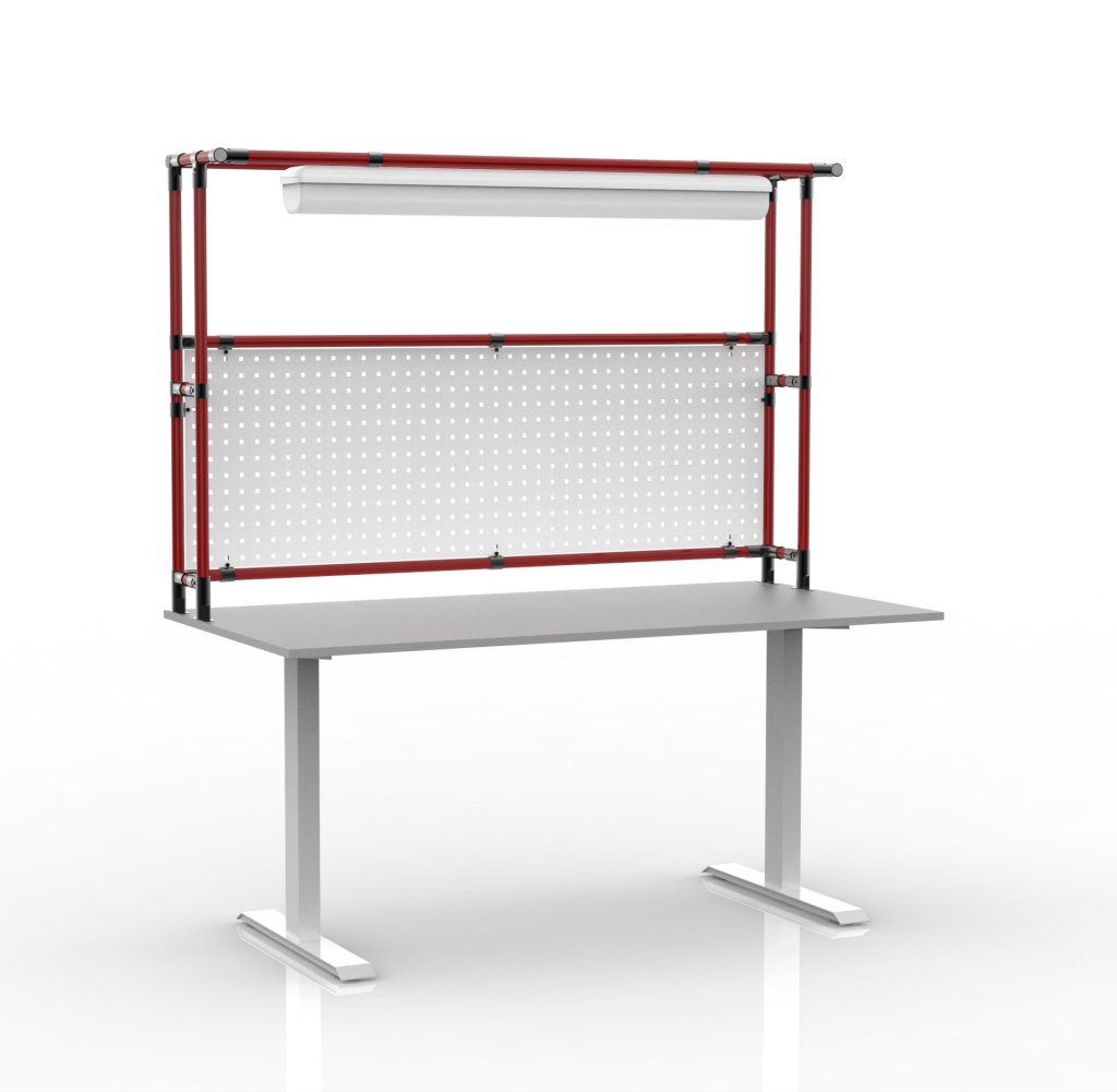 Height-adjustable table with a superstructure made of a tubular modular system and perforated panel. Height adjustment range 726 - 1226 mm. The basis of the table is an electrically height-adjustable base with a perfect combination of stability and durability. The table is completed with an 18 mm thick laminate board, LED light. Load capacity 70 kg. Table dimensions 1765 x 1600 x 800 mm.