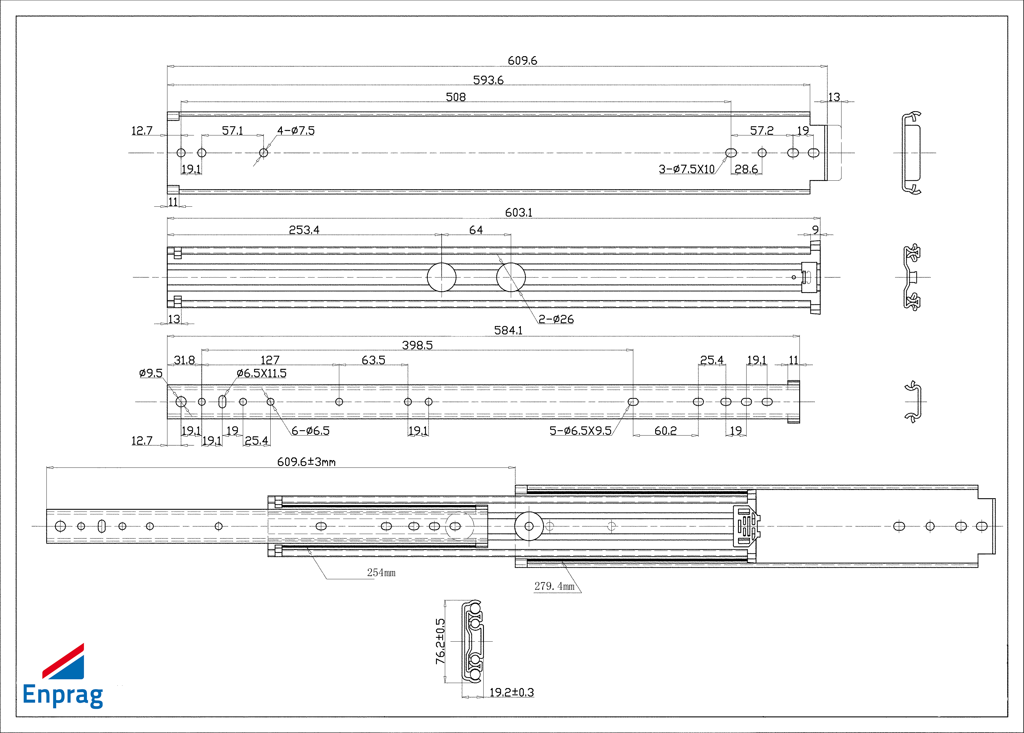 Ball bearing full extension slide, length 609 mm, without damping. Material thickness 2.5 mm. Load capacity 150 kg. full description and parameters
