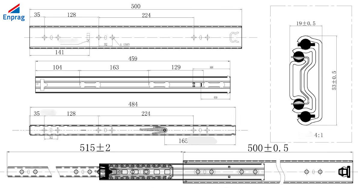 Full extension ball bearing slide, length 500 mm, without soft close. Material thickness 2 mm. Load capacity 90 kg. full description and parameters