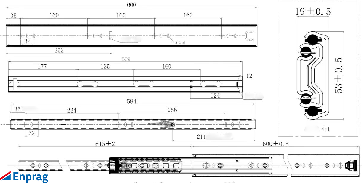 Full extension ball bearing slide, length 500 mm, without damping. Material thickness 2 mm. Load capacity 90 kg. full description and parameters