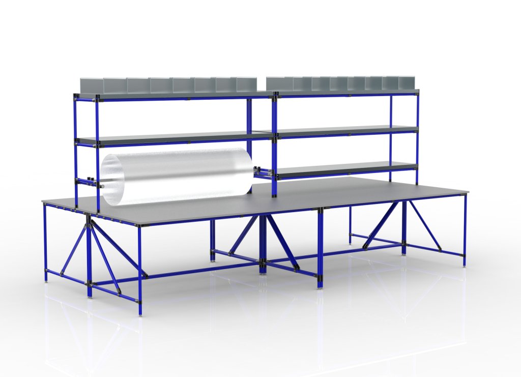 Assembly workplace made from a tubular modular system. The structure consists of four separate tables with an upper extension. The full description and parameters