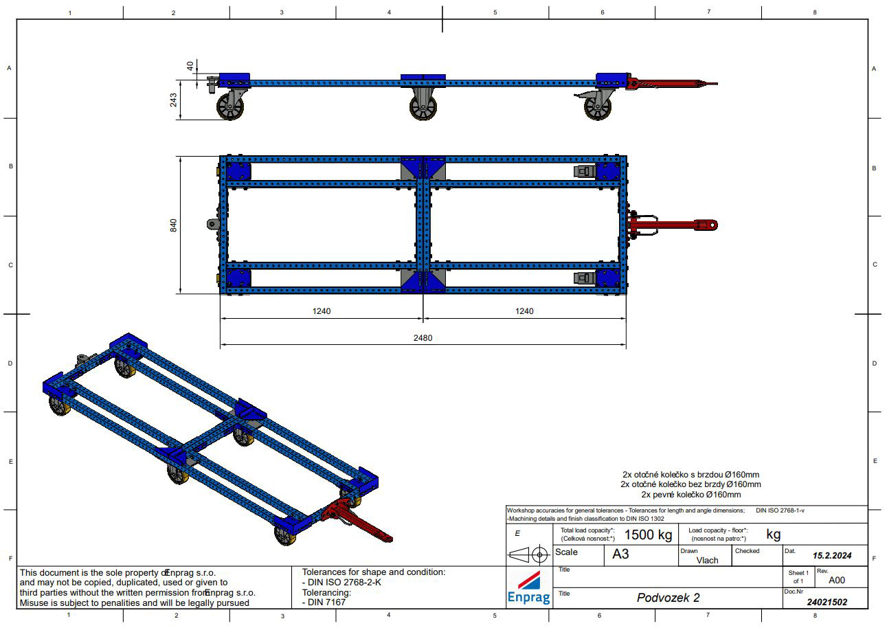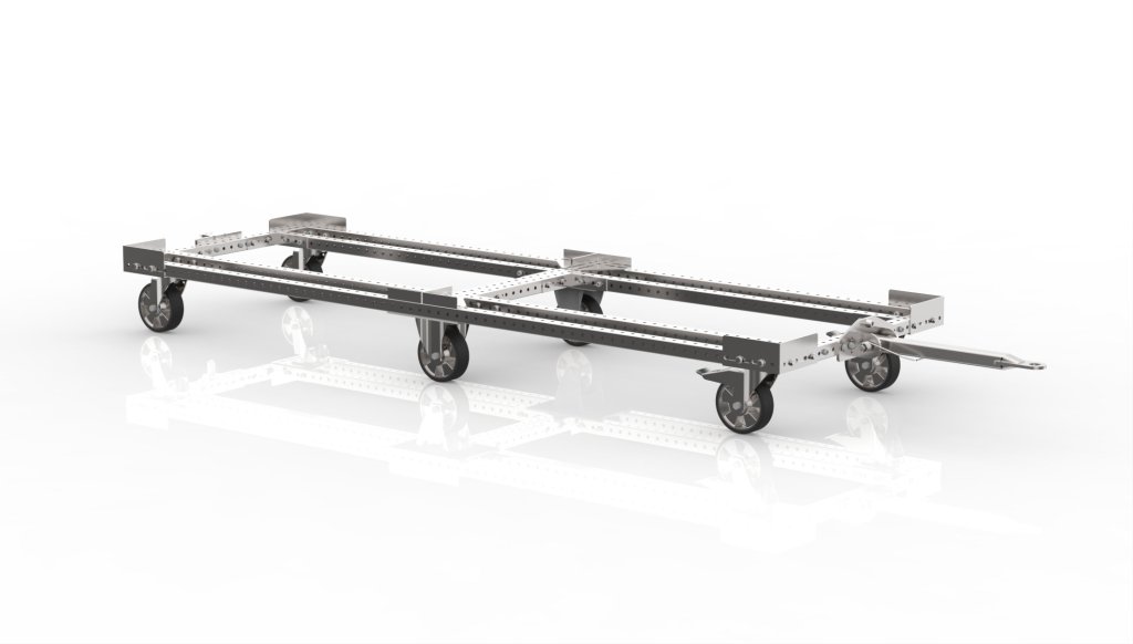 Manipulation chassis made of pre-assembled steels with a size of 40x40 mm suitable for various handling purposes in warehouses and workshops. Thanks to its high load capacity of 1500 kg, it is ideal for transporting heavier objects. The chassis includes 2 x swivel castors with a brake, 2 x swivel castors without a brake and 2 x fixed castors with a diameter of 160 mm, which allow easy handling of objects. The chassis is available in several variants - galvanized surface or colored lacquer. Dimensions 308 x 836 x 2476 mm.