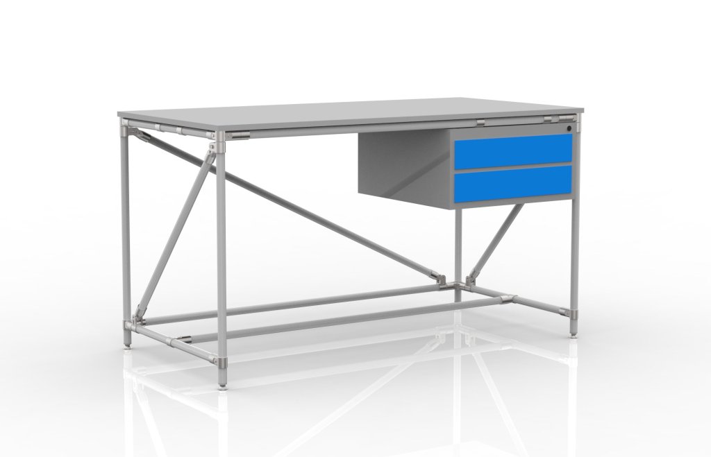 Workshop table made of tubular modular system with 18 mm thick laminate worktop, table container with two drawers and four adjustable legs. Load capacity with a uniform load of 100 kg. Dimensions 850 x 1500 x 750 mm.