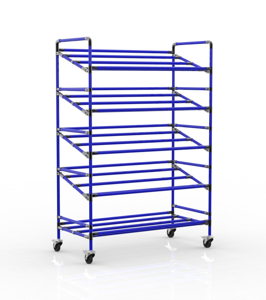 Crate rack trolley with one straight and four angled shelves is a practical helper for handling in manufacturing companies and logistics centers, especially in the field of e-commerce.