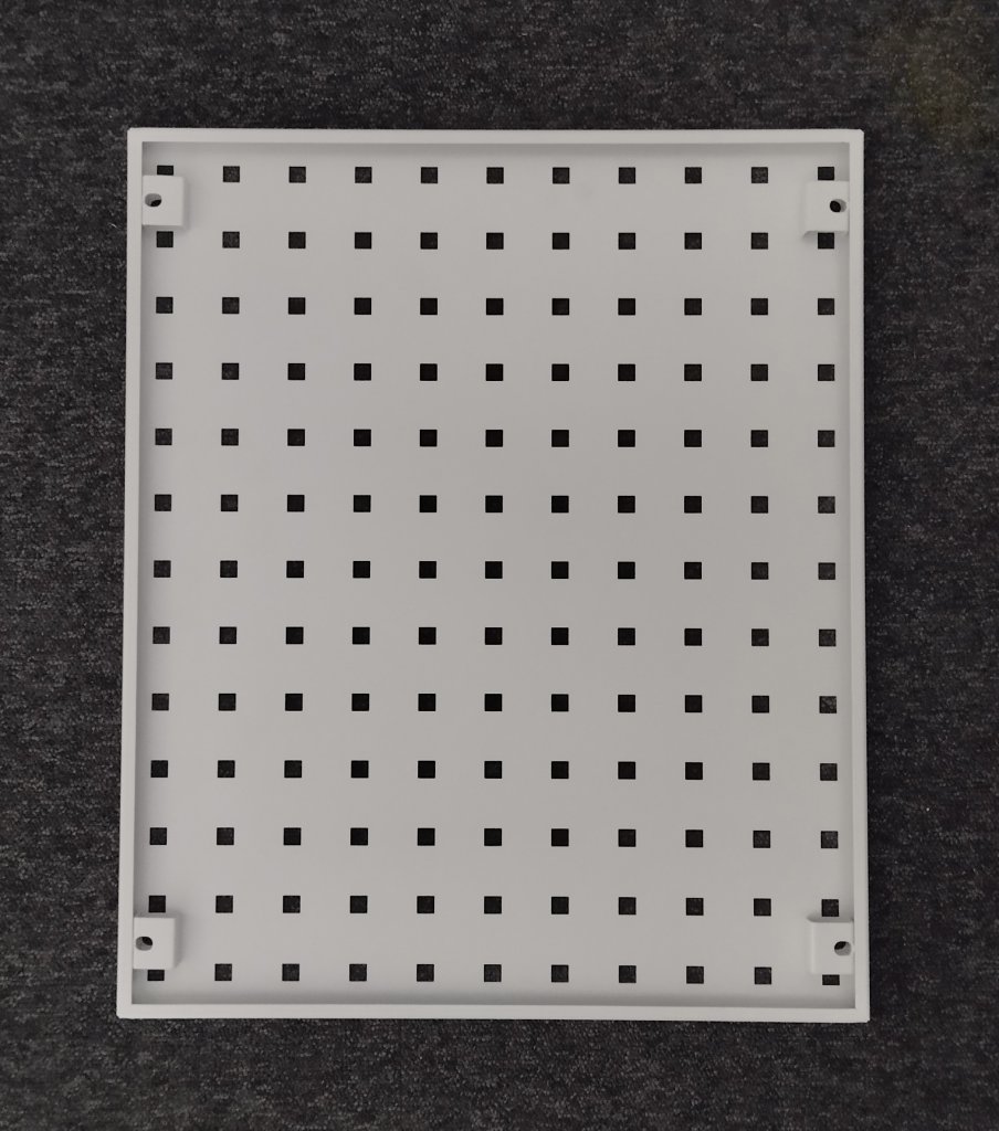 ESD perforated panel with rounded edges. Holes for mounting in a tubular system or on the wall. Ideal for hanging tool holders and quick access to fasteners. The ESD design provides reliable protection against electrostatic discharge. Dimensions 935.5 x 500 mm, thickness 1,4 mm, square holes 10 x 10 mm, hole spacing 38 x 38 mm, color gray RAL 7035.