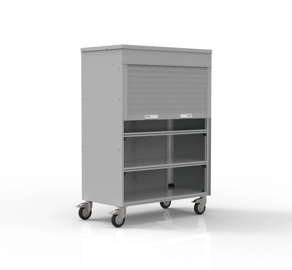 Do you need tools, materials or documentation always at hand and safely stored at the same time? A shelf trolley with a shutter is the ideal solution for workshops, service stations and operational facilities. It combines a durable frame made of aluminium profiles with stainless steel cladding and offers three fixed shelves, each with a load capacity of 75 kg. The total load capacity is up to 300 kg. A plastic shutter protects the contents from dust and unauthorized access, and thanks to swivel castors with brakes (⌀ 125 mm), it is easy to maneuver even in tight spaces. The dimensions 1443 × 1003 × 554 mm provide ample storage space without taking up unnecessary room. Discover a shelf trolley that combines practicality, security and elegant design into one compact solution for everyday use.