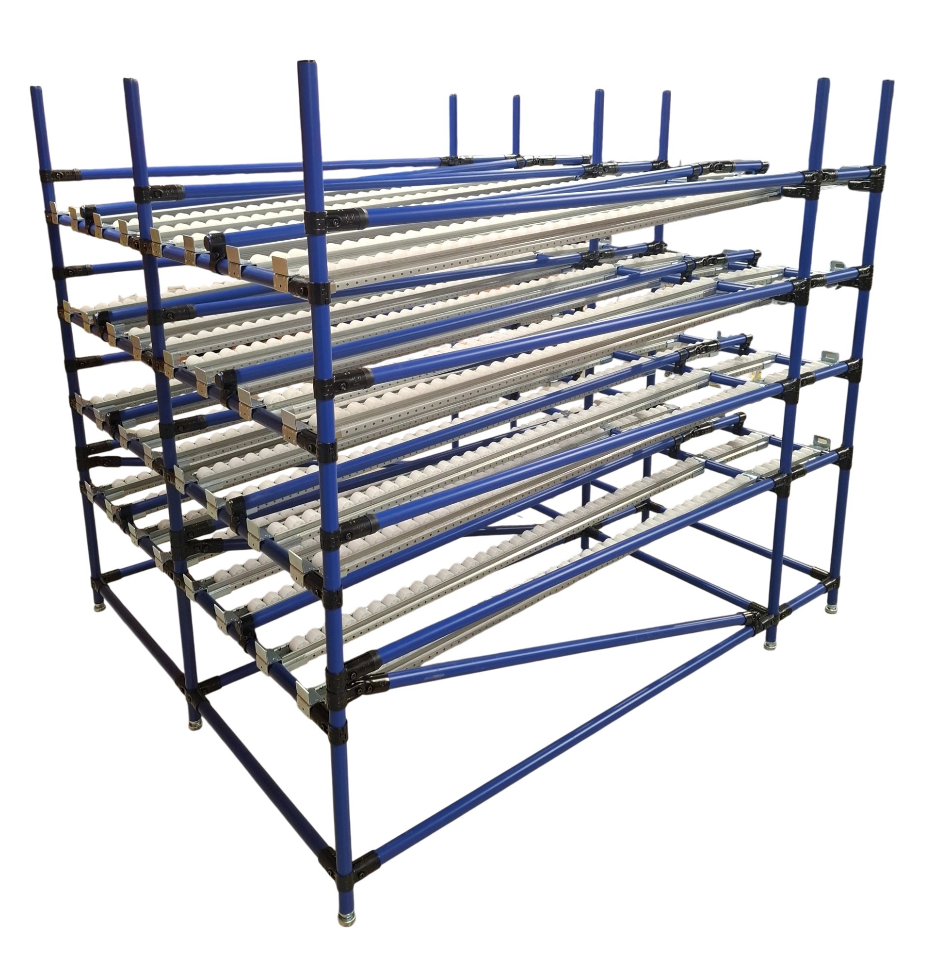 A gravity flow rack made of a tubular system with roller tracks uses gravity for automatic material movement. This means less waiting, faster replenishment, and a well-organized warehouse or production area. Thanks to its modular design, it can be easily adapted, for example, by changing the slope, width, or type of tracks. It supports the FIFO method, so the first goods in are the first goods out, minimizing errors and keeping order. Gravity flow racks save time, increase productivity, and maintain an organized and safe workspace, making them ideal for production lines, warehouses, and assembly stations.