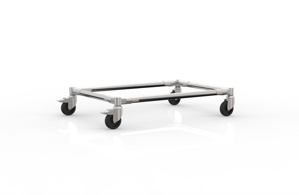 A handling trolley made from a tubular system is suitable for various handling purposes in warehouses and workshops. The chassis includes 2 swivel casters with brakes and 2 swivel casters without brakes, with a diameter of 75 mm, allowing easy handling of items. The internal dimension is designed for a crate measuring 600 x 400 mm. Dimensions are 678 x 478 x 138 mm.