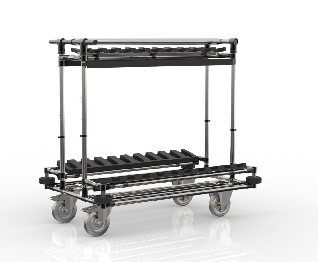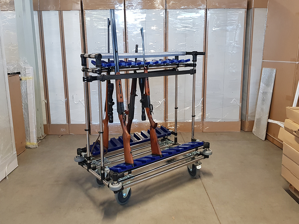 Height-adjustable weapon cart made from a tubular modular system, ideal for safe storage and transport of firearms. The cart full description and parameters