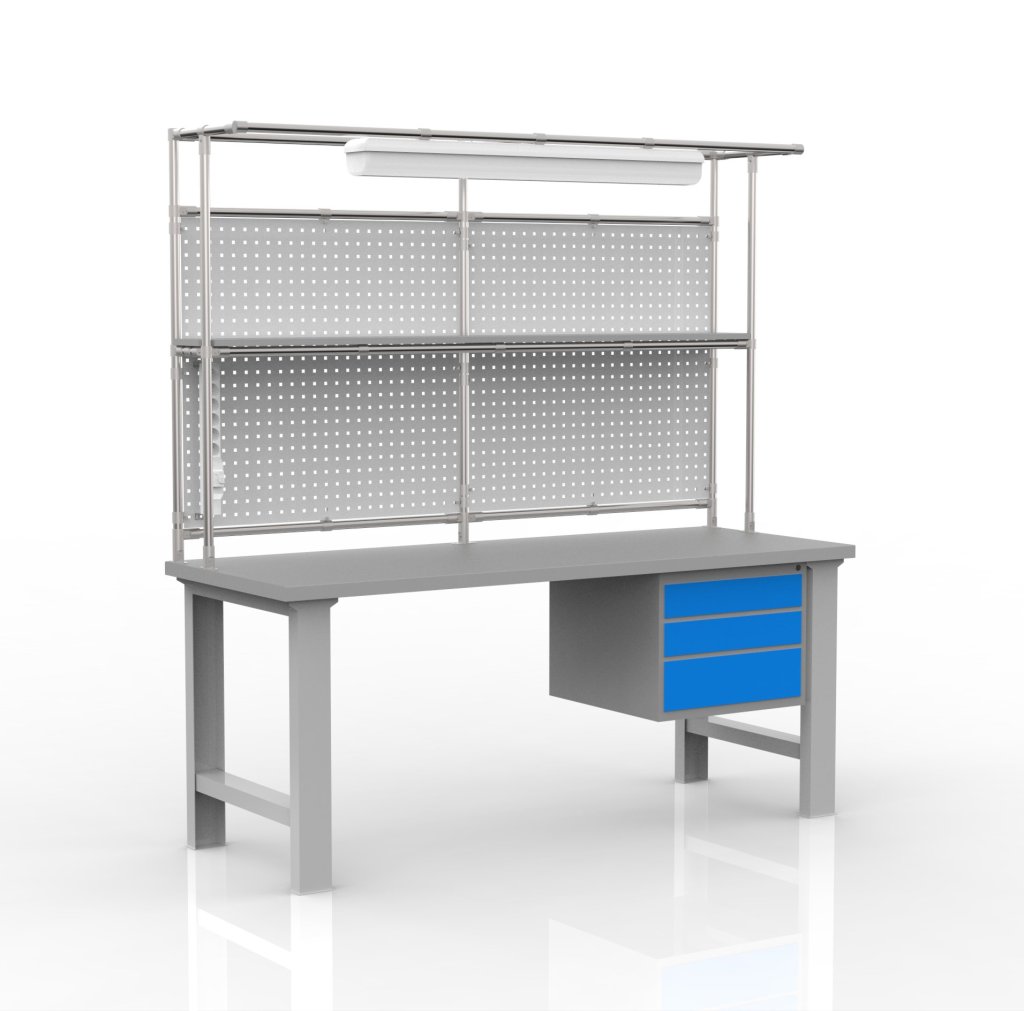 Workshop table made of aluminum profiles. The table includes a laminate board with a thickness of 18 mm, a table container with two drawers, a perforated panel for hanging boxes or tools, LED lighting and height adjustable feet. Thanks to the use of aluminum profiles, the table is light but at the same time highly strong. Load capacity with uniform load 500 kg. Dimensions 2200 x 1200 x 790 mm.