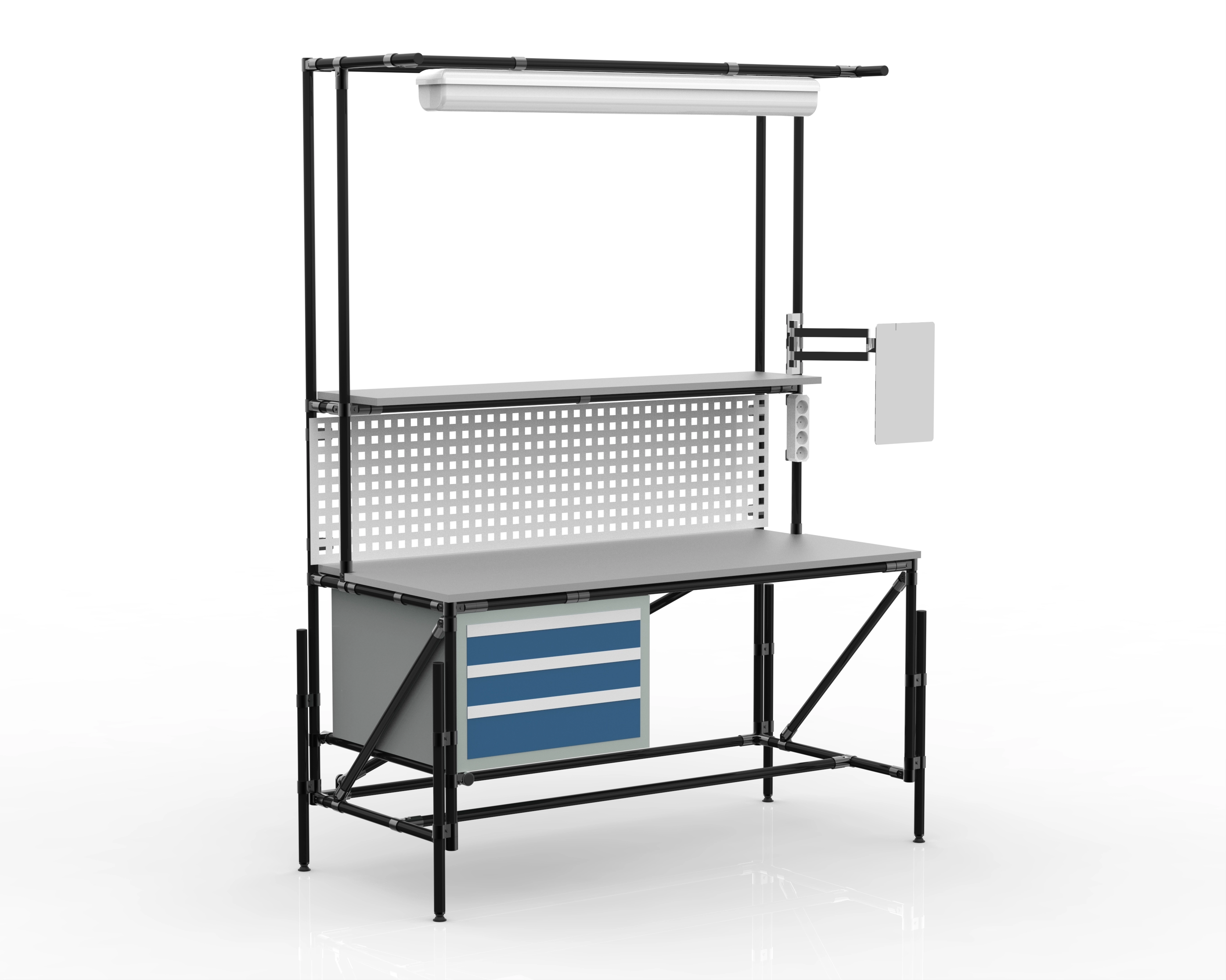 Workshop table from the tubular modular system will give you plenty of room to work. The table is equipped with a 18 mm thick DTDL worktop and a table container with one or more drawers for easier organization. The dimensions of the table can be adjusted according to the customer's wishes, we offer tubes in several color variants, ESD or stainless steel finish.