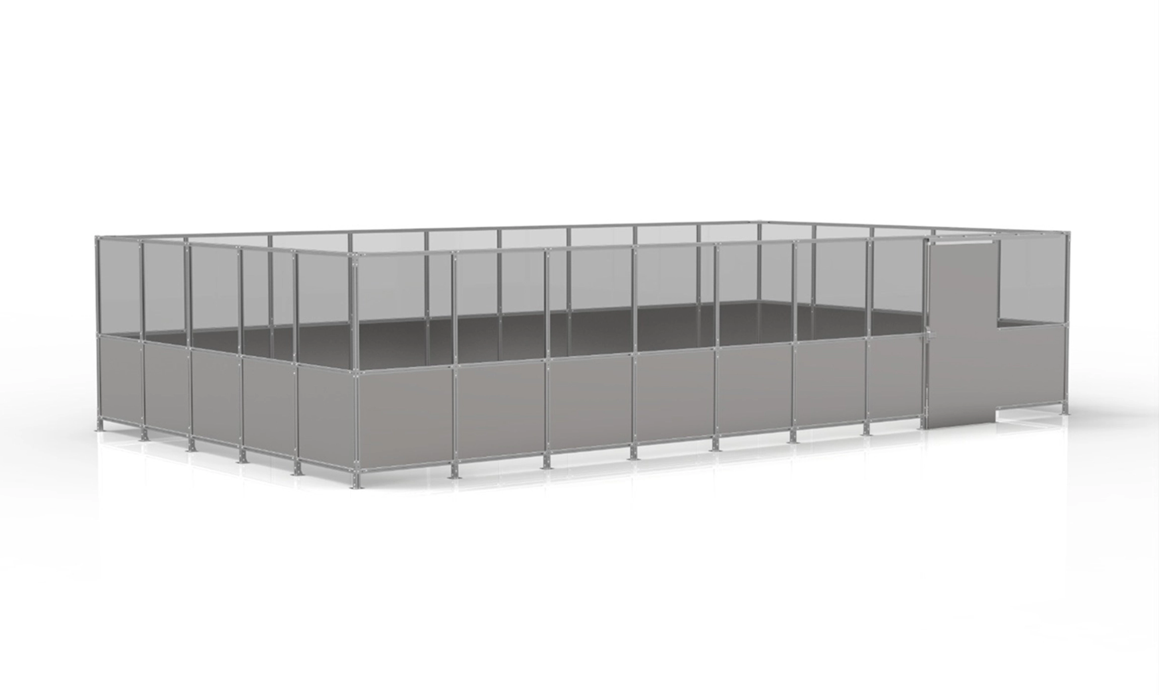 Protective security fencing, also known as a safety enclosure, is an essential element for ensuring safety in workplaces where hazardous machines and equipment are present. It is designed to effectively restrict access to these dangerous areas, thereby significantly reducing the risk of workplace injuries and accidents. This type of fencing is commonly used in industrial halls, warehouses, or production areas. The fencing structure is made of aluminum profiles anchored to the ground using base plates. The panels can be made from various materials, such as galvanized sheet metal or Kasi Glass. The doors are made of laminated board and can be sliding or hinged, equipped with a lock for secure access. The fencing can be customized to meet specific customer requirements and manufactured to order in various designs.
