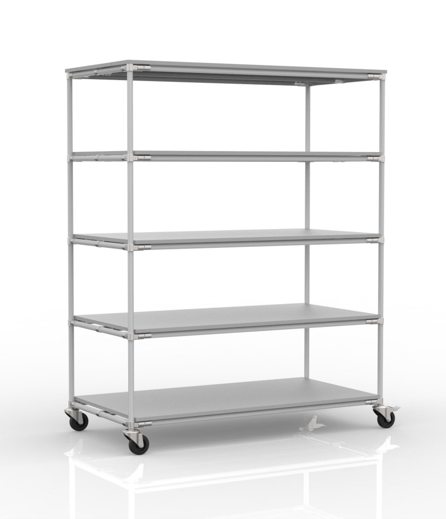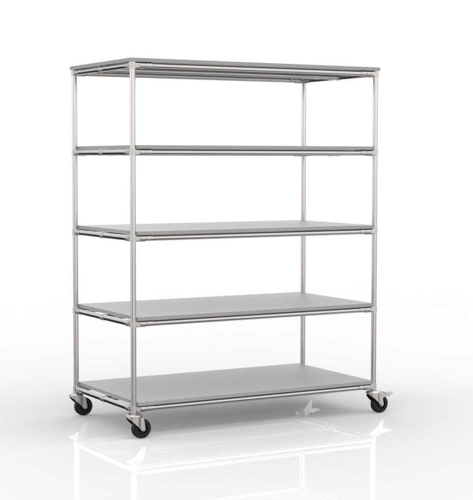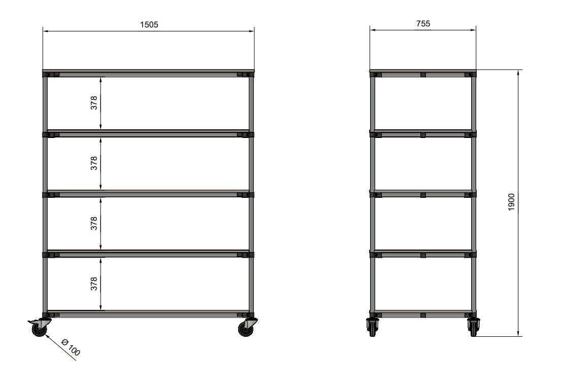 The shelf rack with five straight shelves is a practical helper for handling in manufacturing companies and logistics centers, especially in the field of e-commerce. The cart includes four swivel wheels with a diameter of 100 mm. The advantage of these wheels is low rolling resistance and, thanks to this, comfortable handling. The configuration of the wheels can be changed according to the customer's requirements. Total load capacity 300 kg, load capacity on the shelf 75 kg. Dimensions 1900 x 1505 x 755 mm.
