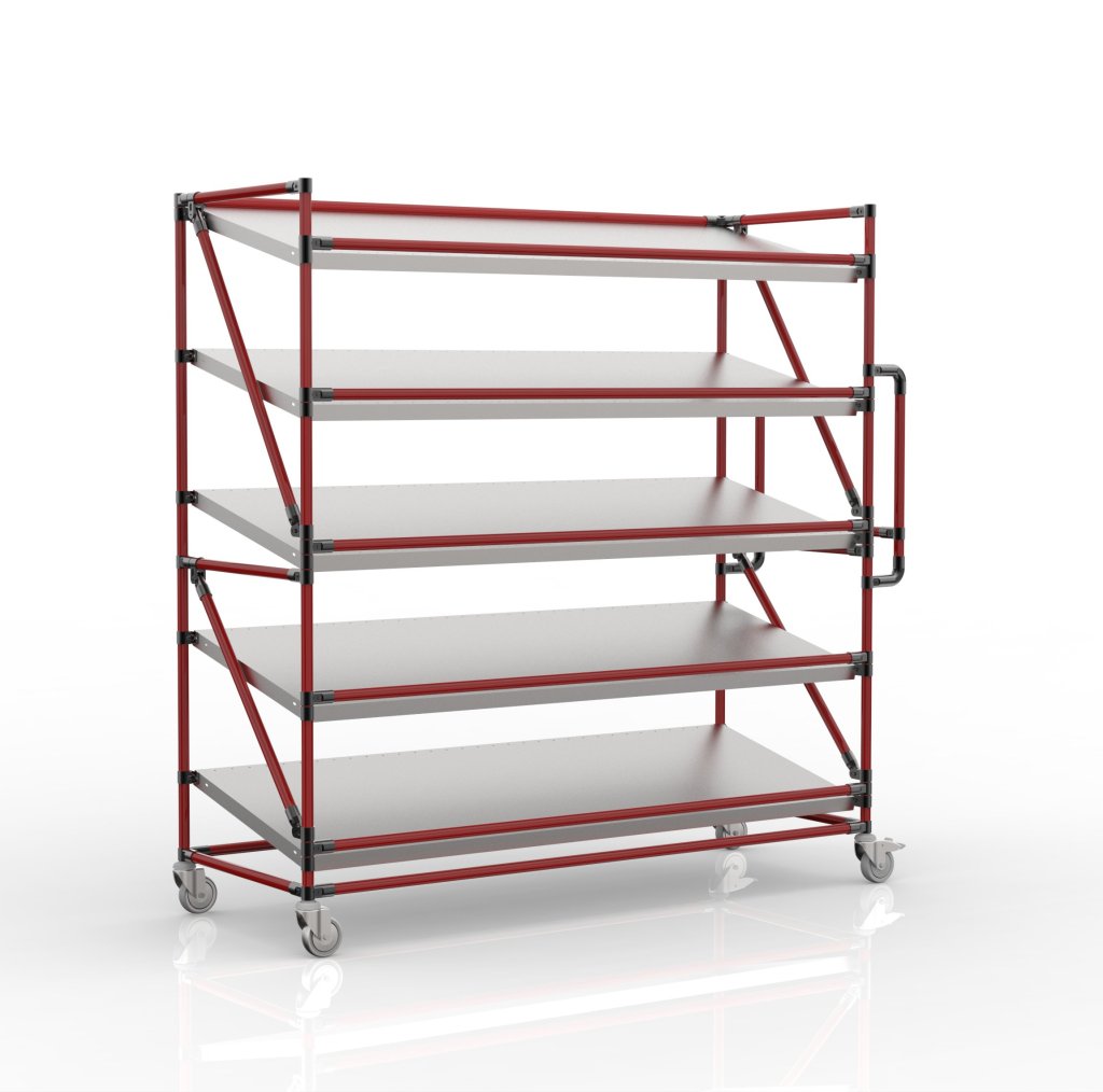 The crate trolley with five inclined shelves is a practical helper for handling in manufacturing companies and logistics centers, especially in the field of e-commerce.