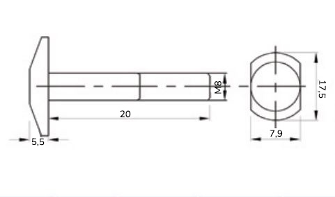 T-head screw for attaching accessories to aluminum profiles. Screw length 20 mm.