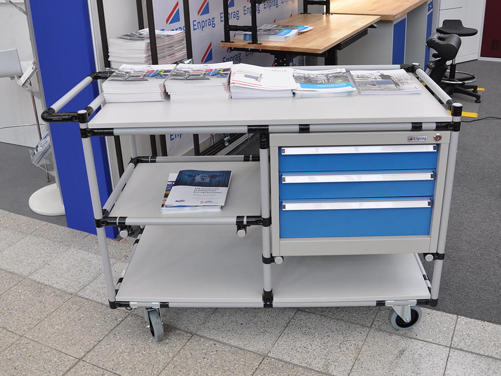 Workshop trolley made from a tubular modular system. This trolley is equipped with an 18 mm thick laminated chipboard that provides a solid and stable work surface. The cart includes four wheels with a diameter of 100 mm and a workshop three-drawer container XB35-3TG for practical storage of tools. Total load capacity 250 kg, floor load capacity 100 kg.