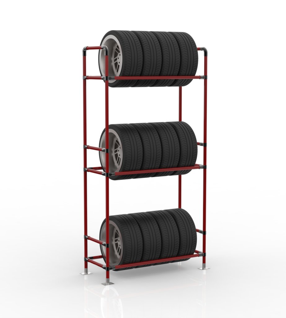 Tire stand made from a tubular modular system with three shelves. Practical storage for up to 12 tires on three levels. Ideal for full description and parameters
