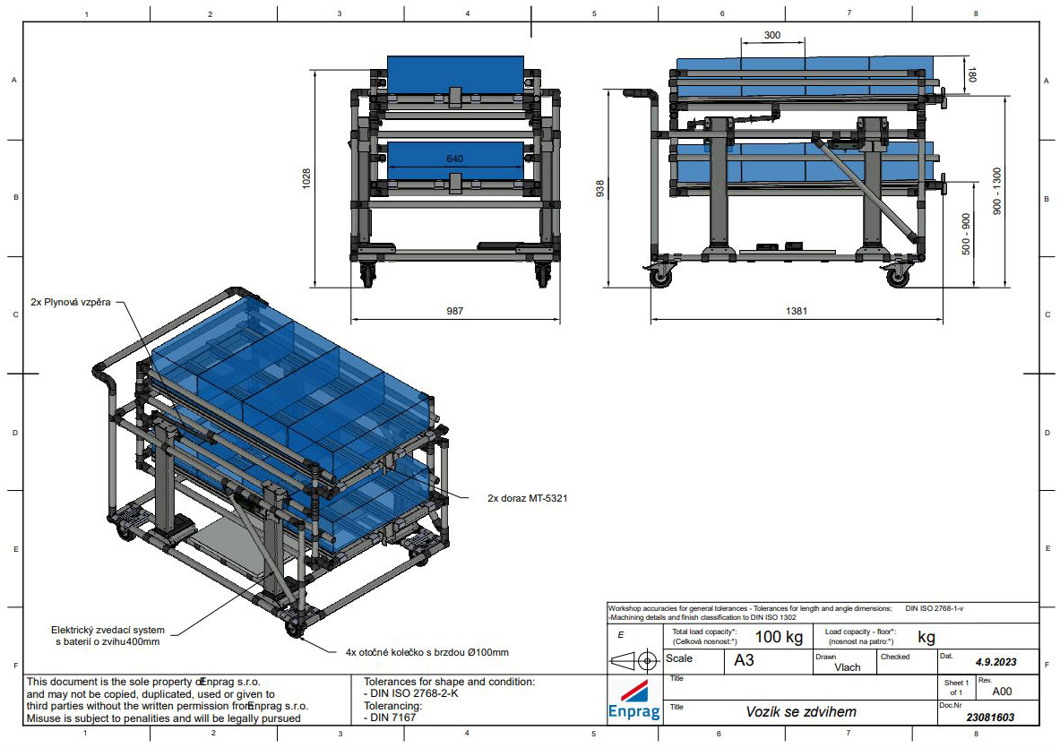 The handling cart with electric lifting system and battery is a suitable addition to all industrial and storage areas. The robust construction and reliable lifting system enable easy and safe transport of loads weighing up to 100 kg and with the possibility of lifting up to 400 mm. With a battery life of up to 3 hours, the handling cart is a reliable helper during the entire work shift. Dimensions 1028 x 1381 x 987 mm.