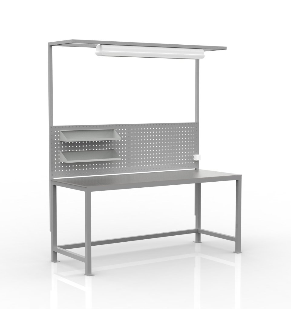 Welded workshop table with extension. The table includes a work surface made of 10 mm thick steel plate, a perforated panel for hanging boxes or tools, a switch for the light, 2 hanging shelves, and LED lighting. The height of the work surface is 800 mm. The load capacity with even distribution is 200 kg. The dimensions are 2100 x 1800 x 700 mm.