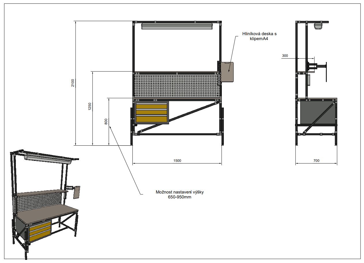 Height-adjustable antistatic table from a tubular modular system. The table is equipped with an ESD laminate board with a thickness of 19 mm, which provides reliable protection against electrostatic charges. Also included is an ESD container, an ESD punch panel, illumination and an aluminum plate with an A4 clip that allows you to keep important documents close at hand. Load capacity with a uniform load of 150 kg. The table has an adjustable height in the range of 650 – 950 mm. Dimensions 2100 x 1500 x 700 mm.