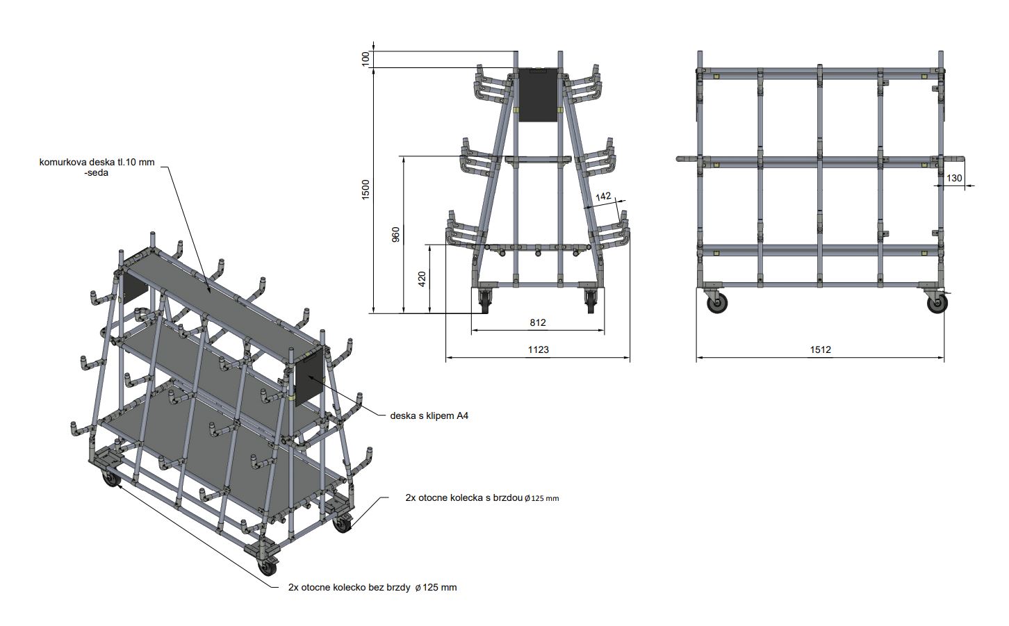 A pick-up truck for transporting products. Included is a board with an A4 clip, 2 x swivel castors with a brake of 125 mm in full description and parameters