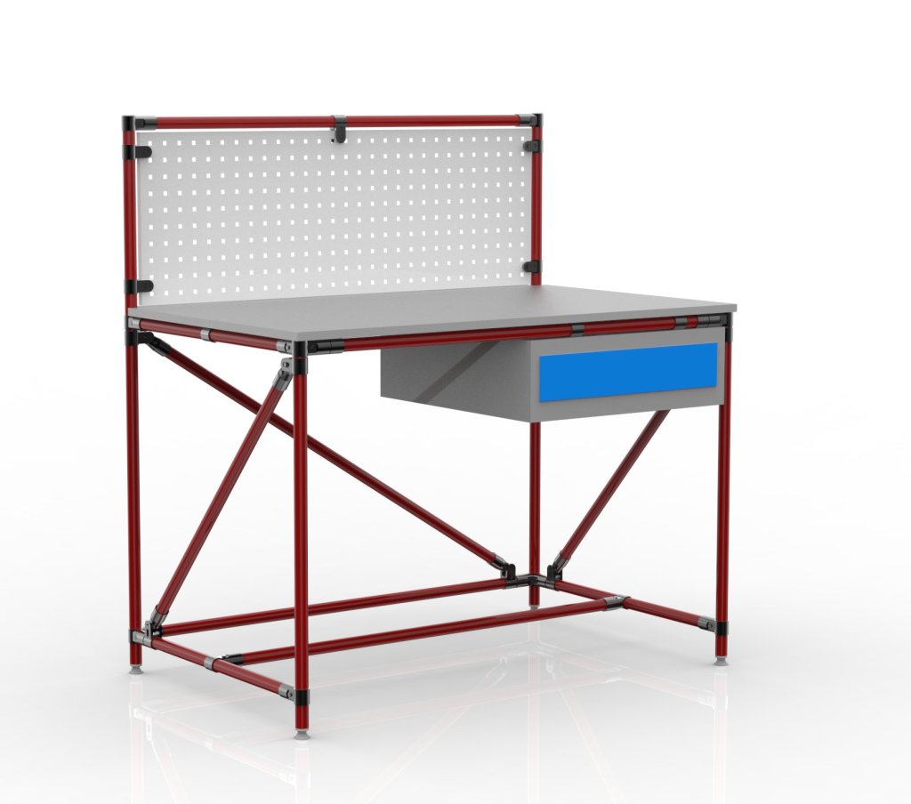 Workshop table with perforated panel from the tubular modular system. The table includes a laminate worktop, a table container with one drawer, a perforated panel and four adjustable legs. Load capacity with a uniform load of 100 kg. Dimensions 1282 x 1200 x 750 mm.