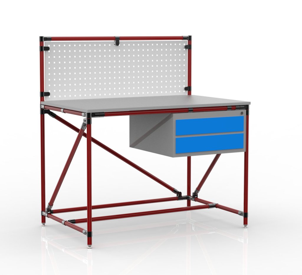 Workshop table with perforated panel from the tubular modular system. The table includes a laminate worktop, a table container with two drawers, a perforated panel and four adjustable legs. Load capacity with a uniform load of 100 kg. Dimensions 1282 x 1200 x 750 mm.
