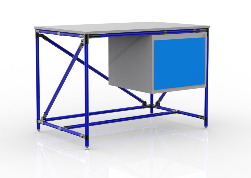 Workshop table made of tubular modular system with 18 mm thick laminate worktop, table container and four adjustable legs. Load capacity with a uniform load of 100 kg. Dimensions 850 x 1200 x 750 mm.