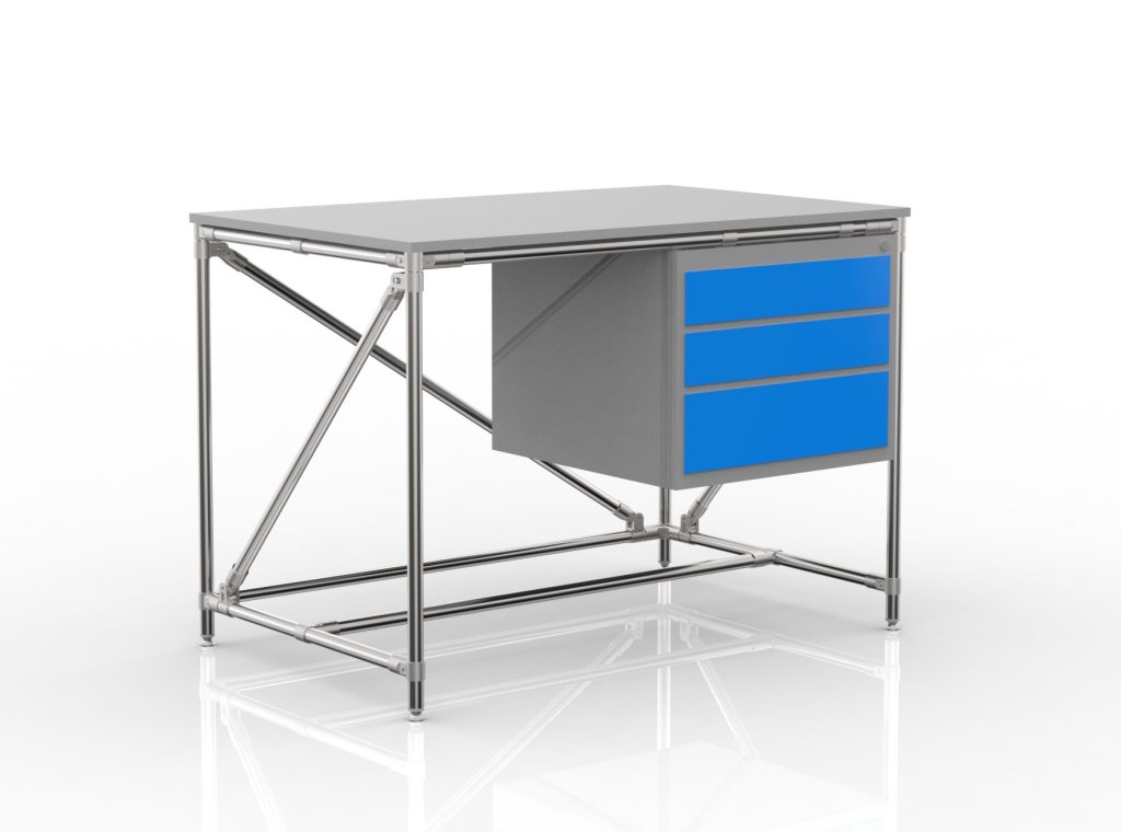Workshop table made of tubular modular system with 18 mm thick laminate worktop, table container with three drawers and four adjustable legs. Load capacity with a uniform load of 100 kg. Dimensions 850 x 1200 x 750 mm.